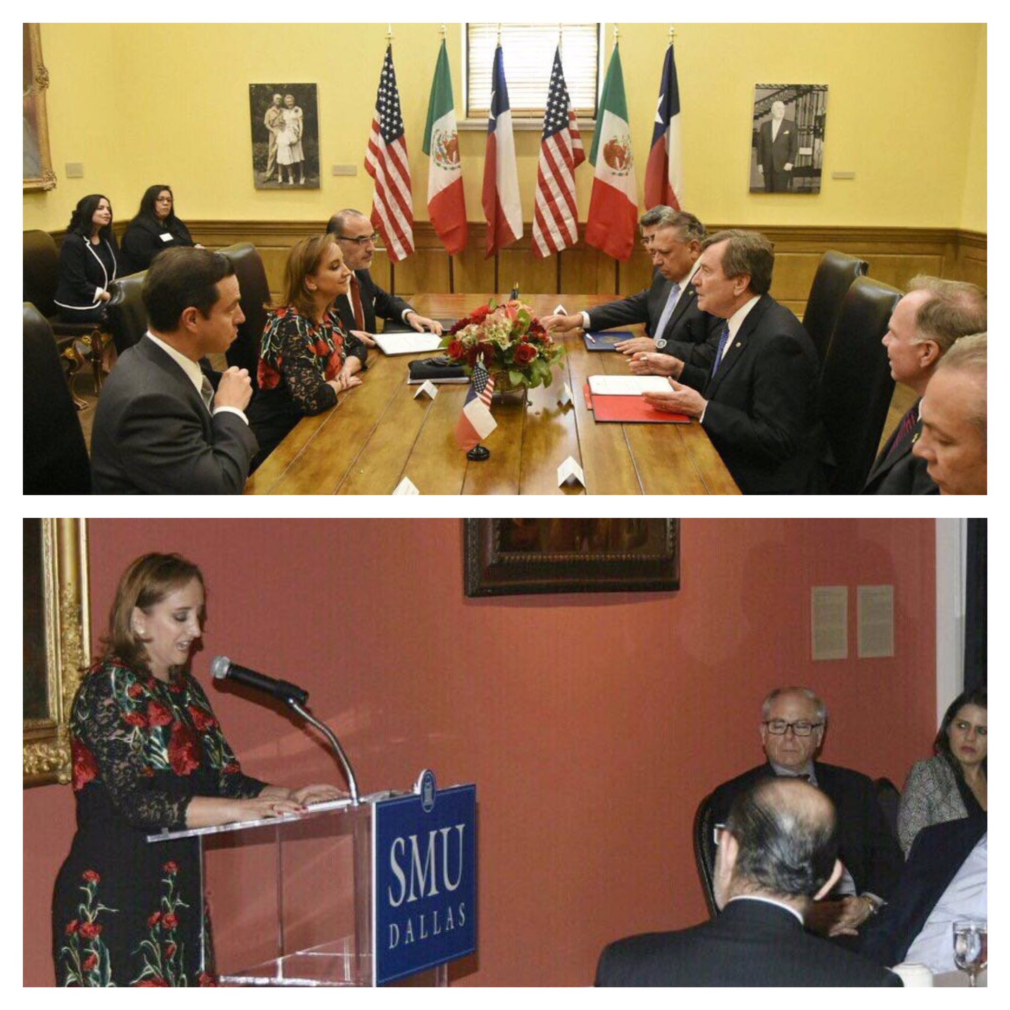 En el marco de la apertura del Centro, la Canciller sostuvo un encuentro con el Presidente de SMU, Gerald Turner; el Vicepresidente de SMU, Brad Cheves; el CEO de Gruma, Juan González; y el CEO de Mission Foods, Javier Vélez, donde conversaron sobre la importancia de que instituciones públicas y privadas trabajen de manera conjunta para promover un mejor entendimiento entre nuestras sociedades. Asimismo, la Canciller Ruiz Massieu congratuló a la universidad texana por su iniciativa y la consolidación del Centro, y reconoció el apoyo económico otorgado por Gruma-Mission Foods para poner en marcha este importante proyecto.
